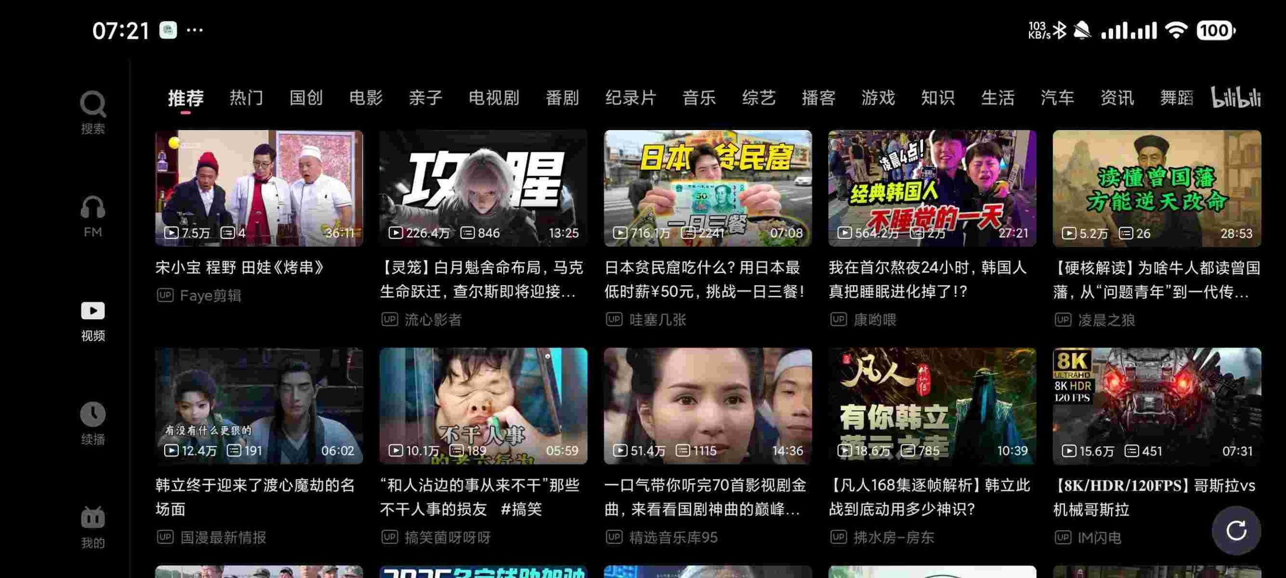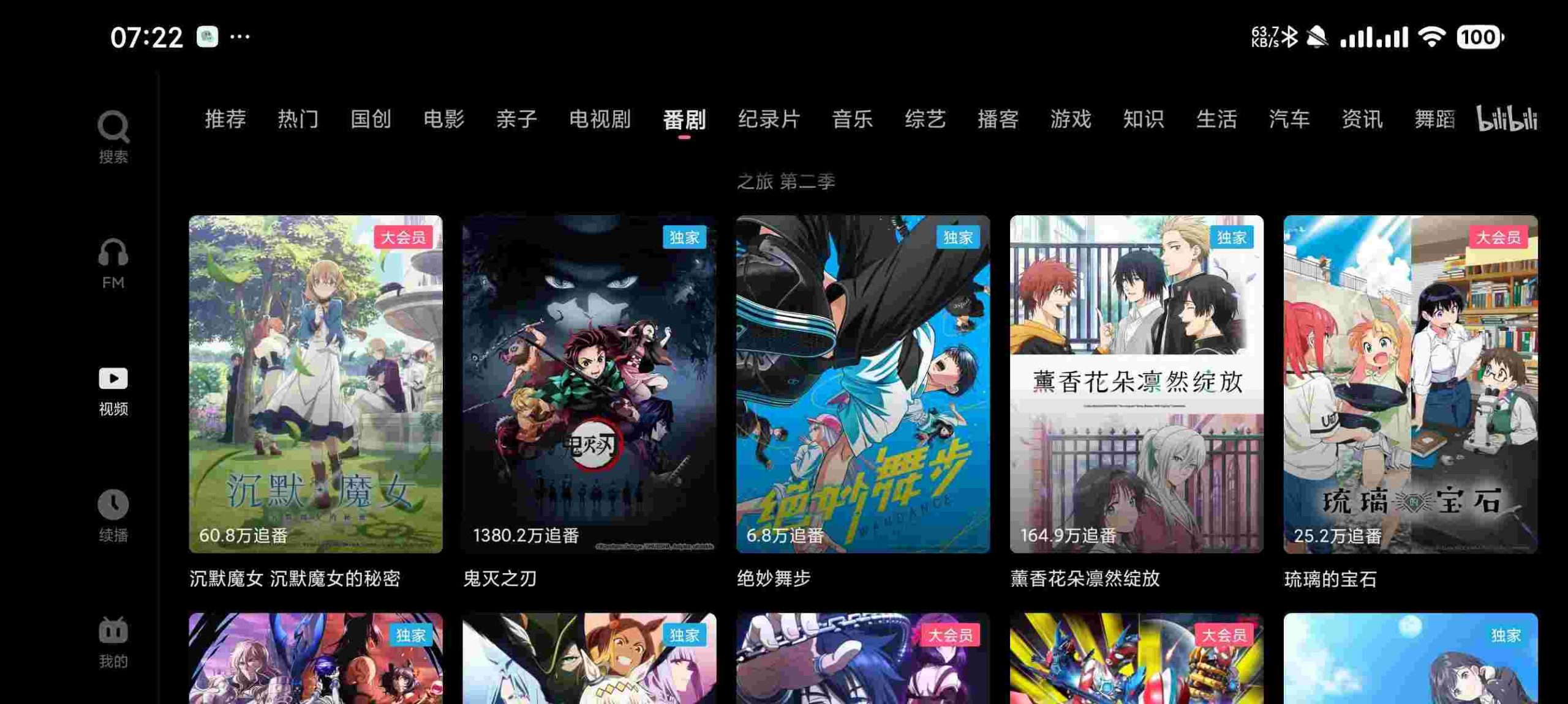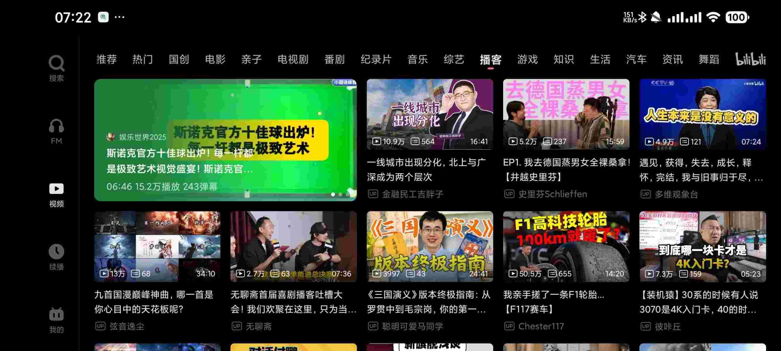哔哩哔哩车机版是专门为汽车端或大屏设备开发的应用程序。考虑到在车上的使用场景,该应用默认界面为FM模式,方便用户在驾驶时通过音频享受内容。左侧界面提供了FM、视频、续播以及我的选项,满足不同需求。页面简洁,无广告干扰,非常适合在车上使用。