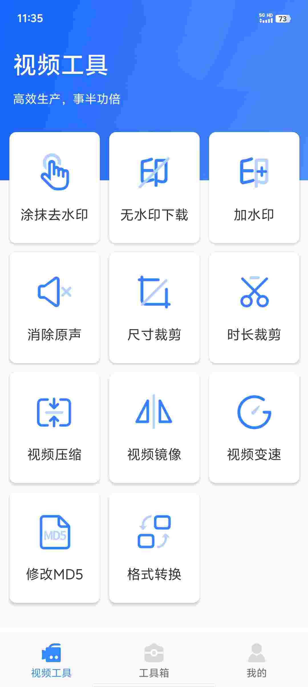 自媒体工具箱是一款助力自媒体创作的软件,它有多种功能,如视频剪辑,能裁剪拼接片段;添加字幕方便快捷;还有音频处理功能。同时支持图像编辑,像是添加滤镜、裁剪尺寸等,帮助自媒体人高效产出优质内容,一款具备视频添加水印、视频压缩、视频裁剪、短视频去水印,修改MD5等多种功能为一体的手机应用软件。