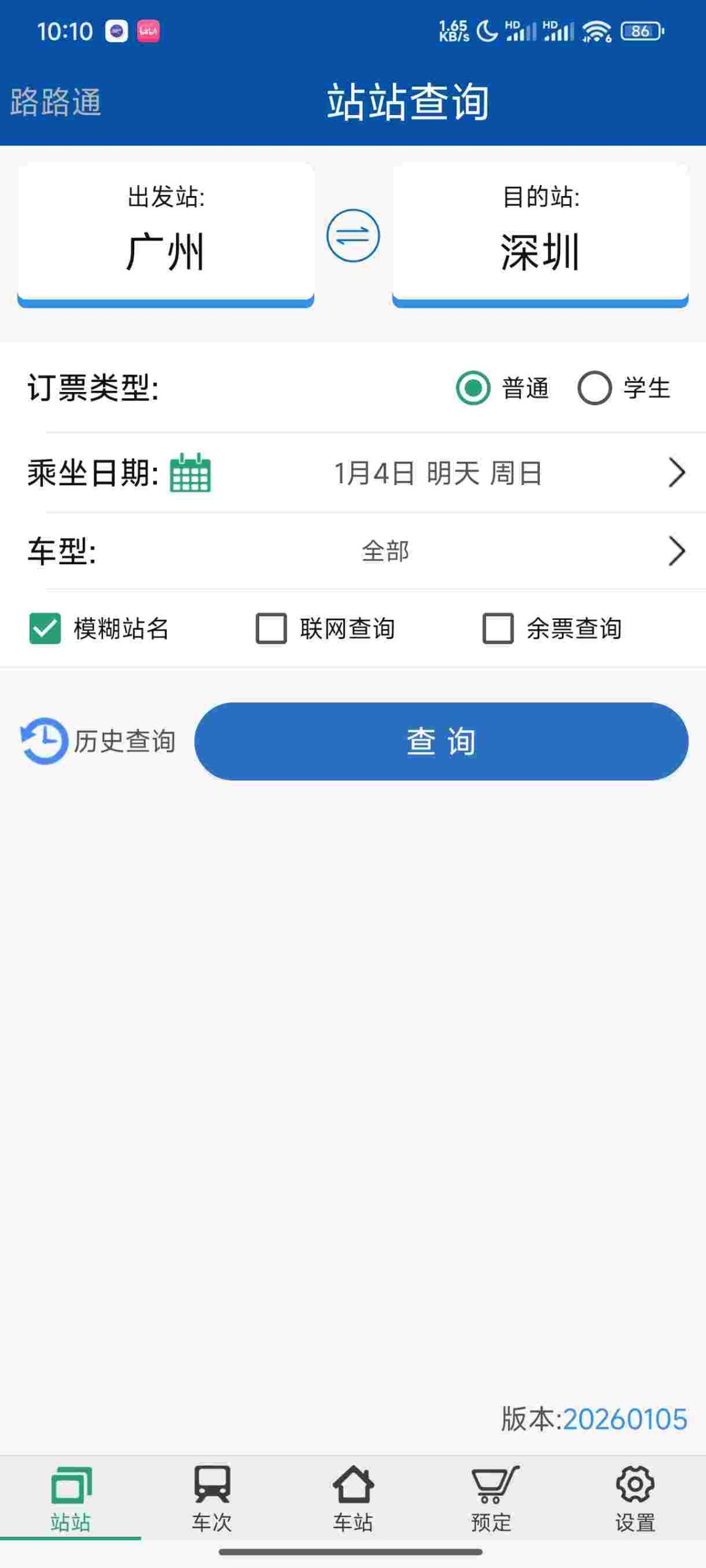 ✅ 多方式查询:站站查询、车次查询、车站查询,支持拼音首字母快速输入