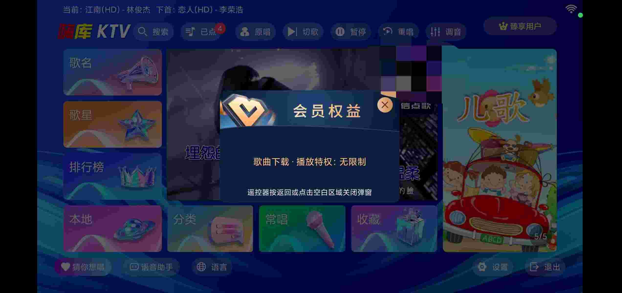解锁VIP会员,永久激活,手机点歌,支持wifi下载歌曲,不需要重启,支持语音点歌,扫码点歌。