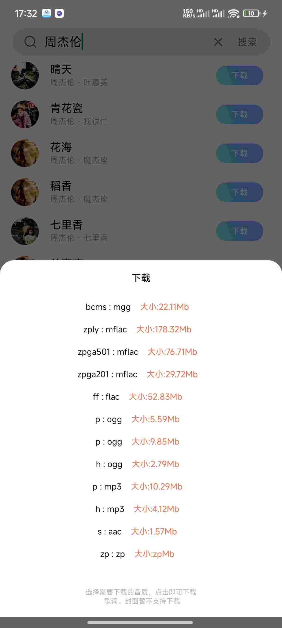 多音质下载:提供从无损(FLAC/MFLAC)、高清(OGG)到普通音质(MP3/AAC)的多种选项,不同音质对应不同文件大小,满足不同存储和音质需求。
