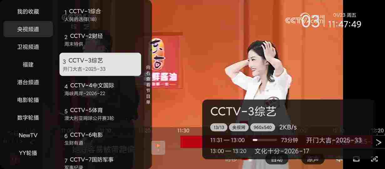 打开应用设置界面,选中自定义直播源项,点击后将弹出历史直播源列表历史直播源列表:短按可切换当前直播源(需重启),长按将清除历史记录;该功能类似于多仓,主要用于简化直播源切换流程须知:当直播源数据获取成功时,会将该直播源保存到历史直播源列表中当直播源数据获取失败时,会将该直播源移出历史直播源列表多线路功能描述:同一频道拥有多个播放地址,相关标识位于频道名称后面切换线路:左右方向键;屏幕左右滑动自动切换:当当前线路播放失败后,将自动播放下一个线路,直至最后自定义节目单设置入口:自定义设置网址格式支持:.xml、.xml.gz格式多节目单设置入口:打开应用设置界面,选中自定义节目单项,点击后将弹出历史节目单列表具体功能请参照多直播源当天节目单功能入口:打开应用选台界面,选中某一频道,按下菜单、帮助键、双击屏幕,将打开当天节目单须知