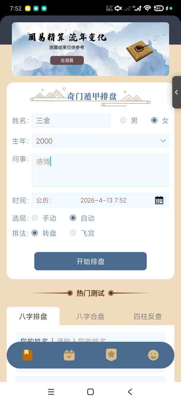 应用名称:奇门遁甲排盘 应用版本:1.4 应用大小:61 应用平台:Android 测试机型:小米15