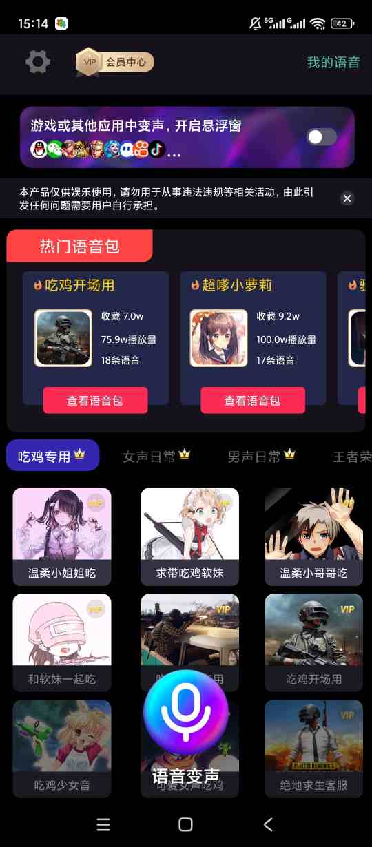 软件游戏实时变音,已解锁VIP会员,所有语音无限制使用,欢乐变声器,游戏变声神器,语音包超全。