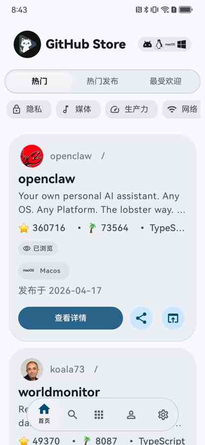 GitHub Store 是一款跨平台开源应用商店,主打发现并安装GitHub各类软件发布版本,可自动识别APK、EXE、DMG、DEB、AppImage等各类安装包,支持一键安装,还能自动追踪软件版本更新。可根据当前设备平台自动匹配提取Release安装包,自带版本更新提醒功能,界面清爽简约,可像普通应用市场一样查看软件说明、星标数据,使用门槛低、实用性强,方便爱好者一键管理GitHub开源软件。